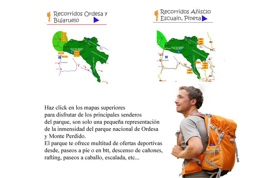 Destaca la rica y variada oferta de senderos que hay a lo largo de todo el parque y del valle de Bujaruelo que aunque no pertenece al parque nacional está pegado a el y ofrece unos paseos inmejorables. En esta web os hemos seleccionado los recorridos que creemos más representativos del parque una pequeña representación de todos los senderos que podemos disfrutar en este extraordinario parque natural. Os hemos dividido los senderos en cuatro zonas. La zona del valle de Bujaruelo, la zona del valle de Ordesa, la zona del cañón del Añisclo y las gargantas de Escuain y la zona del valle de Pineta. Haz clic en cada uno de ellos y empieza a disfrutar de este magnífico parque nacional. |